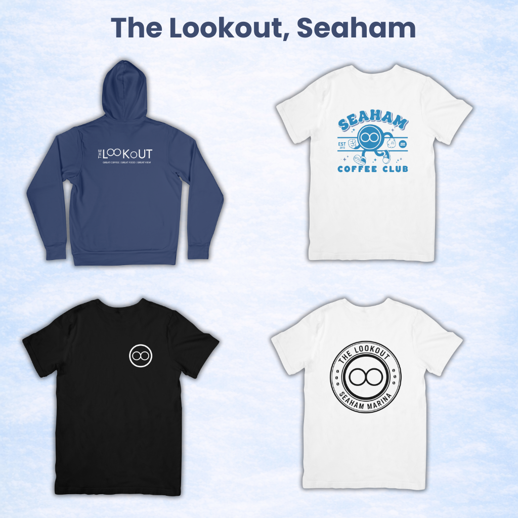 An overhaul and refresh of the staff uniforms was needed by the lookout. Utilizing the navy branding of the business, we designed standout T-shirts, hoodies, and Aprons for the team. Additionally, a custom merch line was created for all lookout fans.